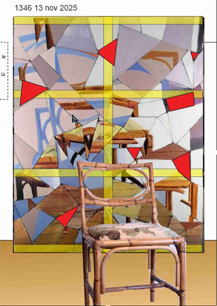 The painting was created from a photograph of a chair taken by a camera looking at a broken mirror.